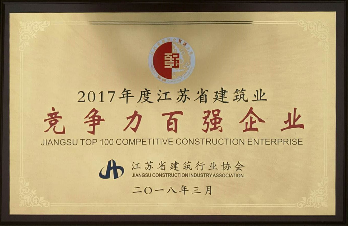 3月28日,江蘇省建筑行業(yè)協(xié)會2018年會暨2017年度江蘇省建筑業(yè)“雙百強”企業(yè)評價排名發(fā)布會在南京召開。集團公司再次榮獲江蘇省建筑業(yè)競爭力百強企業(yè),位列第44位。